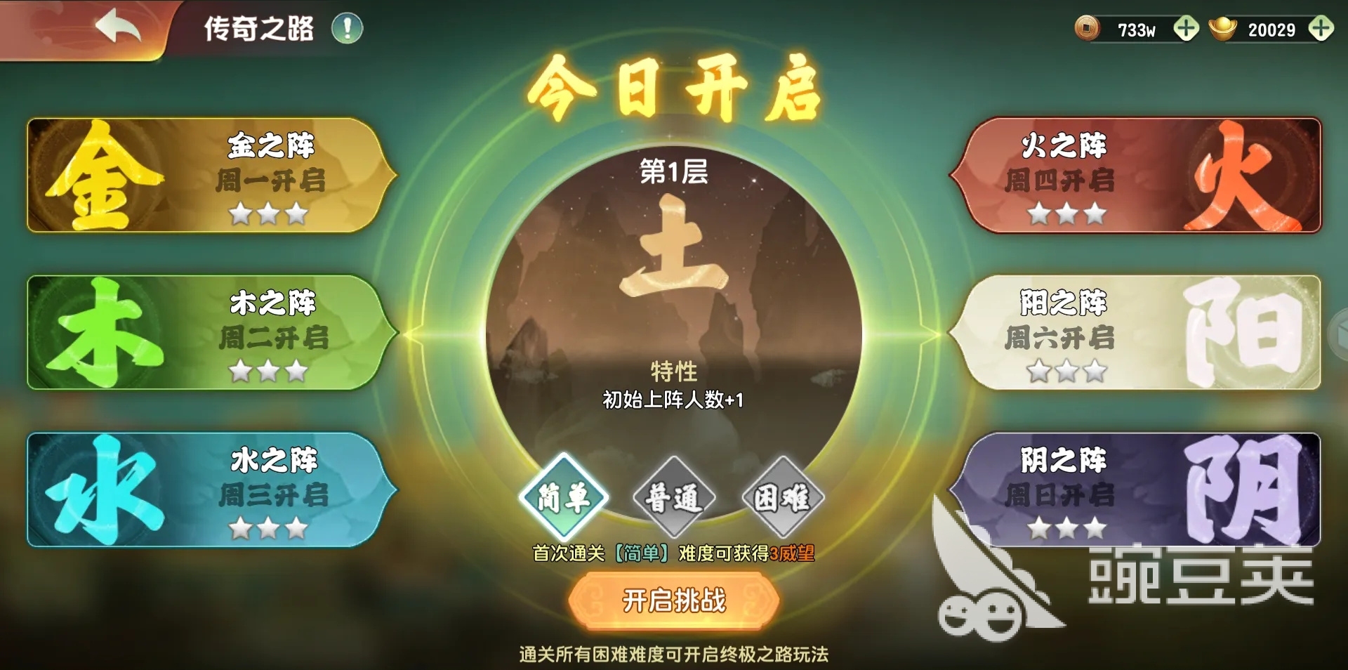 “传奇之路”为周期性开放玩法,每周一至周日每日限时开启(周五除外),共设七大主题阵法,按顺序依次为:金、木、水、火、阳、阴。每种阵法均内置独特规则机制,例如属性增益、站位限制、技能触发条件等,玩家需依据当日阵法特性动态调整阵容构成与布阵逻辑。难度采用递进式解锁设计——当玩家成功通关某日当前难度后,次周同一日期将自动开放更高一级难度,整体挑战强度随周次逐步提升。需注意:每位玩家每日仅可完成一次通关,重复挑战不发放额外奖励。