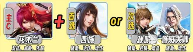 第二个搭配当中大家可以用花木兰作为主要输出,她在对敌人进行输出的时候自身的对抗操作很多,虽然前中期需要一定的培养,但是后期成型之后大家还是不可否认这个角色的强度,还可以化解一部分敌人带来的影响,而这里为了避免受到花木兰前期弱势时期的影响,大家可以给她搭配一个具有足够容错率的角色,比如说西施,西施目前在前期辅助定位上的受欢迎程度是最高的,毕竟目前可选的辅助少,而她正好在辅助当中又是有大家都需要的能力,在治疗上面还可以通过区域给己方其他成员带来恢复,而增伤同时是可以施加给主要输出的,她主要是给自己带来的加血以及针对两者之间搭配的补充输出效果很强,如果大家没有拿到西施的话,这里还可以替换成孙膑以及鲁班大师,不过建议首要还是选择西施跟花木兰搭配,毕竟孙膑的辅助效果当中增益是一方面,另一方面是控制能力更好用,而换成鲁班大师的话,这里就只能用他来进行增伤了。