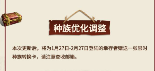 本次更新后,将为1月27日-2月27日登陆的幸存者赠送一-张限时职业重置券,请注意查收邮箱。