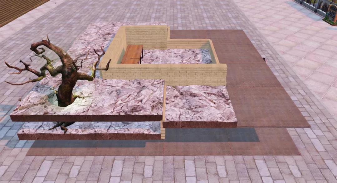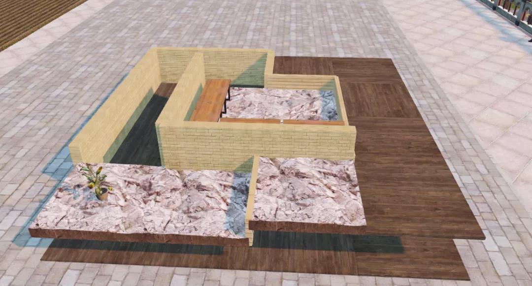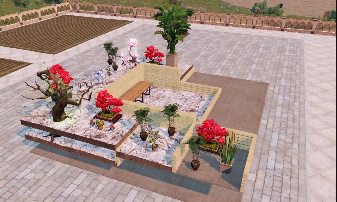 6、在右下角围起一个小角落,放上几个盆栽,也可以在四周的厚石地板上放几盆绿叶植物或花盆装点我们的小院子。