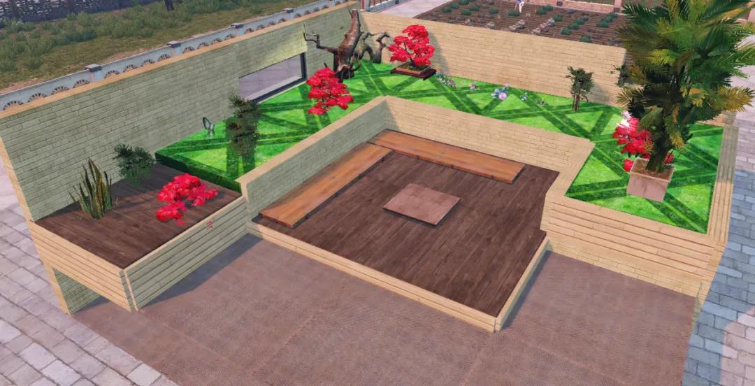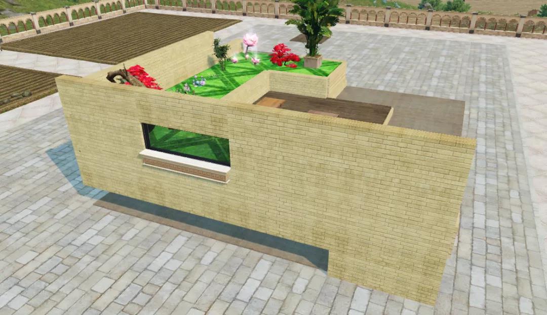 9、为前面围起的小角落铺上地板,然后给院子的两个方位都铺上墙壁小院子就基本成型啦。