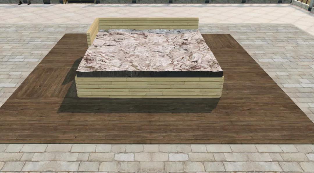 1、首先在庄园中铺上4*4的地板,然后在中间4格地板位置周围,放置如图矮墙+半身墙的结构,然后在方形空间上铺上厚石地板。