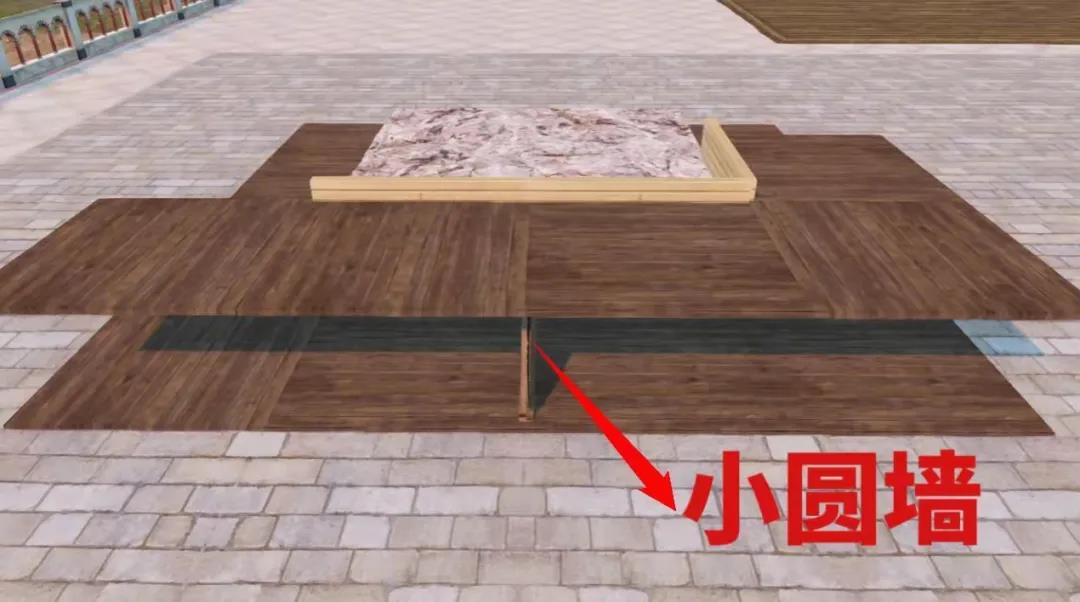 2、接下来在两面半身墙中间放置一面小圆墙用于支撑,在圆墙上贴着半身墙放置五块地板放好后再回收小圆墙。