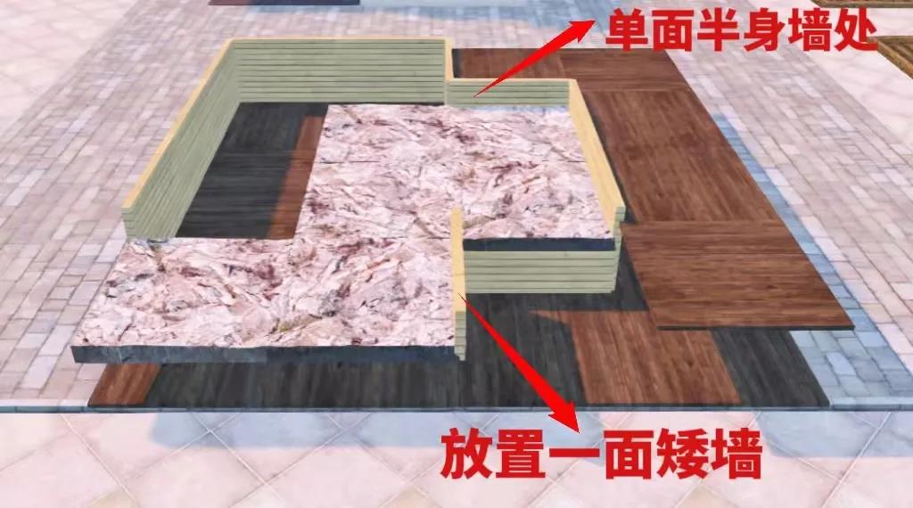 3、在单面半身墙处围上半身罗马墙,在图上位置放置多两块厚石地板,并放置一面矮墙,矮墙上再放一块厚石地板。