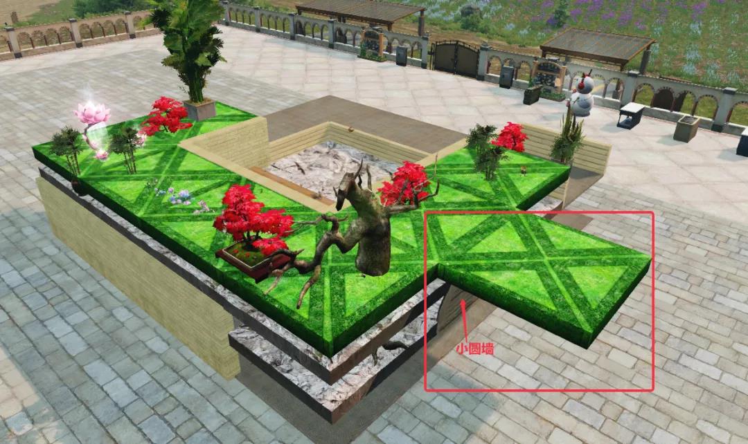 7、在此处放置小圆墙+绿意地板作为支撑物来铺上其他绿意地板,铺好后即可回收支撑物。
