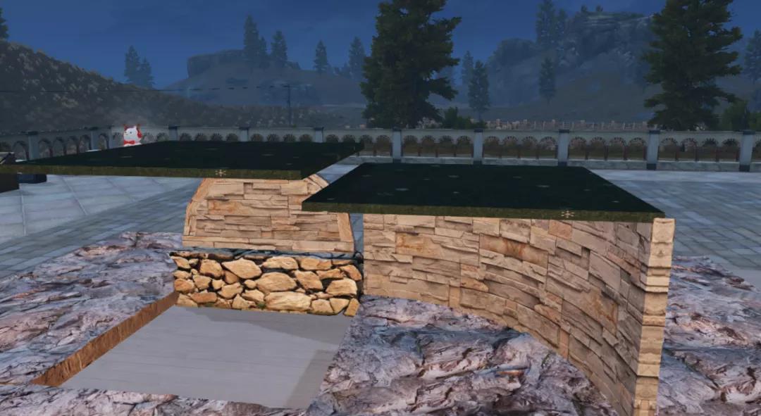 2、在矮墙周围放置厚石地板,并贴着矮墙放置弧形半身墙,在半身墙上再放一块普通厚度的地板,于是在两块地板中间便形成了高度差,接下来就到了见证奇迹的时刻。