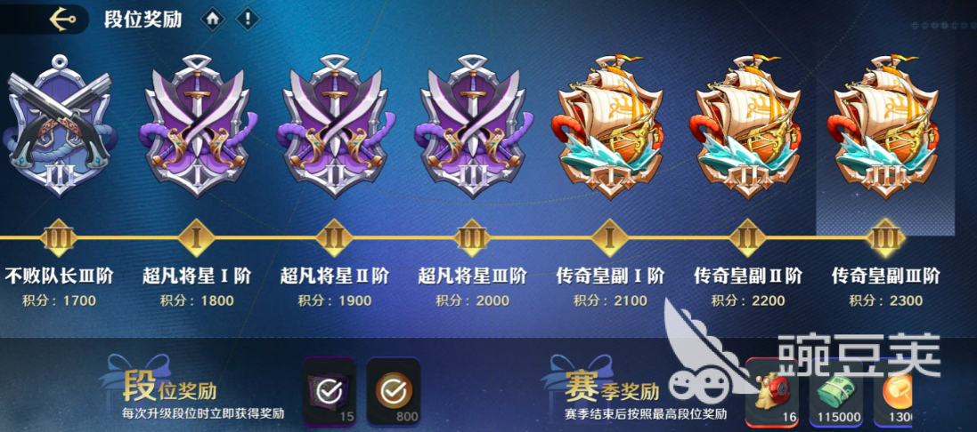 在排位赛季当中,玩家可根据积分获得不同的奖励,而在该游戏里段位分别包括普通海贼,中等海贼,精英海贼,不败队长,超凡将星,传奇皇副等八个不同的段位。而每个段位的积分也有所不同一个段位被分为三个阶,每升一阶积分就提升100。段位达到最高等级后可解锁赛季奖励,要想参排位赛,玩家需前往相对应的竞技场板块。