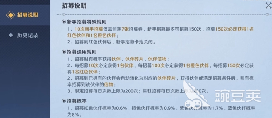 同时新手招募还设有次数限制,最多可招募150次,这样的设计既保证了玩家能够充分体验招募的乐趣,又避免了过度消耗资源,在150次的招募次数结束后,这个卡池就不再开放,但是其中给大家带来的一个福利就是当玩家在新手招募中达到150次时,必定能够获得一名红色伙伴和一名橙色伙伴,相当于是有150抽一个红色伙伴的保底,那么红色品质角色作为游戏中的顶级战力,拥有强大的技能和属性,所以肯定是大家的抽卡第一选择。