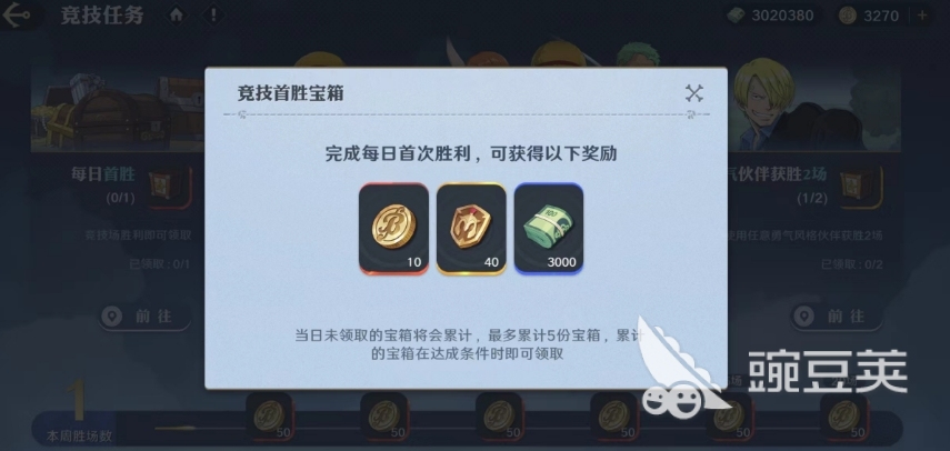 其中刷新的任务和奖励将激励玩家更加努力地提升自己的实力和竞技水平,每天凌晨5:00时,系统会刷新1份每日首胜宝箱,只要玩家在竞技场中获胜一场,就可以领取这份首胜宝箱,如果当日未开启的宝箱,系统会自动累计,最多可以累计5份,这意味着玩家可以在一天内多次获得首胜宝箱,除了每日首胜宝箱外,游戏还设置了每日任务。