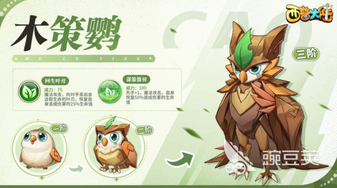 角色在一阶状态只是一个眼睛大大的小鸟,看起来非常的可爱,等二阶段之后角色头上会长出绿叶,这时候也是比较呆萌的状态,等到三阶才会进化的像军师一样,除了回生叶刃之外,这个角色还有一个名为谋策箭雨的绝招,使用这个招式之后角色直接会发射叶刃,不但能给对方造,还会把伤害的50%转化为生命值加到自己身上。