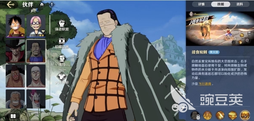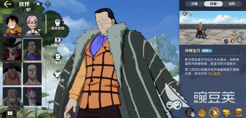 鳄鱼这个角色的名字其实有很多,航海王壮志雄心老沙是谁大家知道吗?老沙也是针对鳄鱼效果的一个戏称,本来航海的过程中很难看见沙漠,但是因为有果实能力,所以游戏当中大家也可以看到沙漠景象,这里所有的沙子都是可以成为沙鳄鱼的增益道具,且在增益上面带来的也是多方面的效果,绝对不仅仅作用于输出哦。