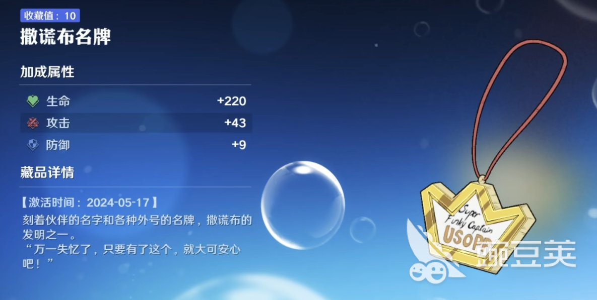 解锁乌索普后,前往工厂界面并点击他,即可轻松拿到这块“别具一格”的名牌。它诙谐幽默的设计非常符合乌索普的性格,也是粉丝们值得一收的趣味小物件。