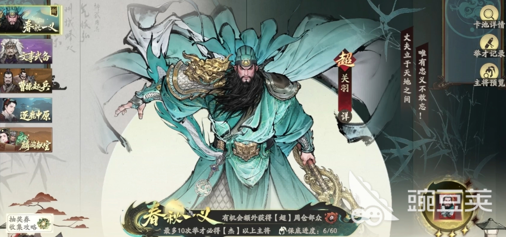 而在武将限定池和武将常驻池之间,优先考虑抽限定池,毕竟限定是能歪出常驻武将的,且三国望神州的武将需求在于精而不在多,因此限定池的抽取收益会更高一些。同时,此作有着保底机制,且分为抽取次数保底和限定超品保底。抽取次数保底的意思很简单,各位最多进行60次抽卡就必定能得到超品武将,若此时出现的武将不为限定,那下一次抽取的超品武将会触发限定超品保底,必能让各位拿到卡池里的限定武将,所以在各位抽卡资源足够的情况下,最多120抽就能拿到限定。