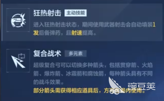 逆战未来中的复合弓是大家经常会用到武器,这把武器的技能一狂热射击在武器进入到狂热射击的状态以后,在这个期间使用主武器射击后,武器能自动填装1发后备弹药,射速还会提升,因为有这个技能技能存在,可以说复合弓不管搭配哪一种主武器都会带来不俗的表现,技能2复合战术,复合弓可以自由的切换不同类型箭头战斗,每一种箭头都带有不一样的战斗效果,不过,这些不同的箭头需要获得相应的道具才能在战斗中使用。