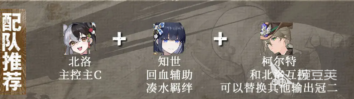 因为要看此时北洛跟敌人的距离怎么样,然后使用技能三就可以消耗一格斗志进行输出,最后在连招的结尾上面,大家再一次使用技能三,这样消耗的斗志越多的同时,伤害就会越高,这样一个连招输出就是北洛最适合的手法,而在配对上面的话,大家可以推荐北洛放在主要控制或者是主要输出的位置上面,她在这方面都是有相关技能可以释放的,其次搭配的辅助可以用知世这个角色,只是知世的辅助能力主要是放在回血上面,并且她跟北洛放在一起还可以凑齐水类型的羁绊效果,在水属性的羁绊效果点亮之后,整体队伍的提升又会上一个档次,最后还可以搭配一个柯尔特,柯尔特跟北洛的搭配也是一个经典搭配。