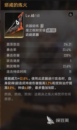 也有一些玩家认为可以选择使用惩戒的炼火过渡了。这一个武器只需要通过刷本获得材料就能够铸造,获取的难度真的并不是很高。如果是对比春玦戟。那这一个武器主要的优点就在于可以支撑面板。被动能力就可以获得20%~40%的威力加成,在一开始用来堆属性还是很不错的。不过还有一点需要注意,这武器的被动加成其实是有限制,一般只会对自己生效,并不会加到其他的武器上面。好在在第2次测试的过程中,近战武器本身就只是一般用来作用于过渡,那还是很不错的,可以直接拿到毕业武器,然后再重新的更换。