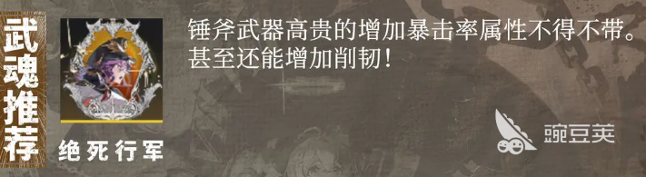 绝死行军:适合锤斧类角色使用的一个武魂,可以提升高贵的增加效果,在暴击率属性上面也可以带来一定百分比的提升,但是最主要的还是增加削韧的效果,在搭配上面如果跟SSR角色搭配的话是很强的,也有玩家尝试过跟克拉拉一起搭配,带来的加成比较全面。