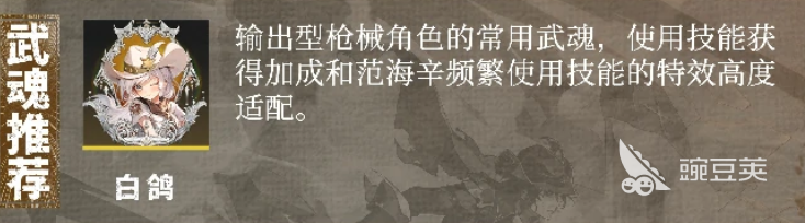 白鸽:是一个比较适合输出型角色使用的武魂,但是更搭配的是枪械类型的角色,如果是跟范海辛一起大诶的话,还可以带来频繁使用技能的次数提升效果,在武魂的特效上面是高度适配范海辛这个角色的,所以经常两者绑定上场,带来的效果是普攻或者是魂技命中敌人后,后续的2秒内再次使普攻或者魂技,在伤害数值上面会增加10%,这样的效果最多的话是可以叠加10次的,也可以搭配奥利维娅之类的角色用。