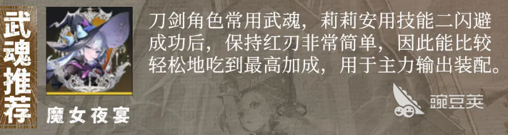 魔女夜宴:是刀剑类的角色常用的一个武魂,特别适配莉莉安,毕竟这是一个冠2角色,所以强度很高的同时搭配这个武魂之后,莉莉安还可以用技能二闪避敌人的输出,只要闪避成功后期保持红刃就非常简单了,这也是这个武魂能够带来的继承,因此搭配这个武魂之后大家就能比较轻松地吃到最高的加成数值,所以这个武魂也是可以用于主力输出来装配的。