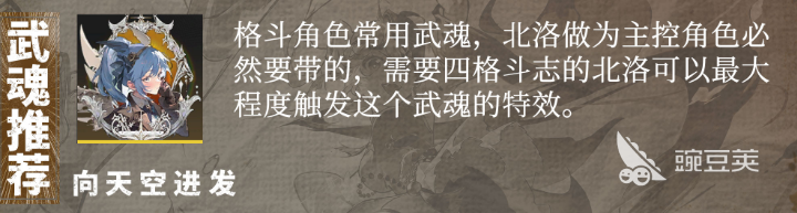 向天空进发:这是属于格斗类型的角色常用的一个武魂,一般在北洛做为主控角色的时候必然要带的就是这个武魂,搭配这个武魂之后在战斗中就需要四格斗志进行提升效果,此时的北洛可以最大程度触发这个武魂的特殊效果,带来输出上面的数值提升,一般只要是队伍当中的主要C位角色都可以搭配这个武魂。