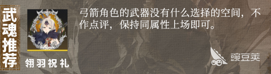 翎羽祝礼:是一个比较适合弓箭角色搭配的武魂,整体的效果是体现在武器家和才能上面的,其实现在的弓箭类角色在武魂上面没有什么选择的空间,相对其他的武魂来说翎羽祝礼带来的属性搭配数值是最好的,只要保持同属性上场就可以触发武魂效果,所以这也是目前最推荐此类角色搭配的武魂。