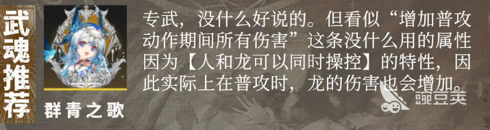 群青之歌:属于一个专武类型的武魂,一般就是固定给伊莱莎使用的,在效果上面是没什么特别的弱点,有着看似增加普攻动作期间所有伤害之类没什么用的属性,但是因为这个武魂还可以带来人和龙可以同时操控的特性,所以搭配上之后在实际的普攻时,龙的伤害也会增加一部分数值,针对伊莱莎的输出提升效果最强。