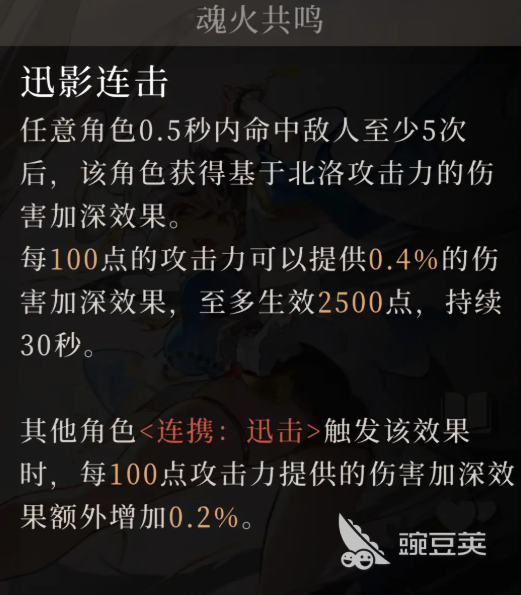 北洛跟柯尔特他们俩搭配带来的魂火共鸣效果是迅影连击,也就是在任意一个角色只要是0.5秒内击中敌人的话,还可以在击中至少5次之后,让其中的角色获得根据北洛攻击力来计算的伤害加成,这里的加成效果是指在每100点的攻击力作为基础数值的时候,还可以再提供0.4%的伤害加深效果,不过这个效果最多是可以生效2500点的,且在生效的时间上面可以持续30秒的时间,此时如果是其他角色带来连携迅击的效果,那么只要触发这个效果,那么后期每100点的攻击提供带来的伤害加深都还有更多的提升,会有这样效果额外增加0.2%的数值效果。