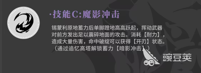 锡蒙利的技能三叫做魔影冲击,使用这个技能之后锡蒙利在魔力数值虽然需要在原地蓄力一段时间,但是后期挥动自己的武器,对前方造成很大能力的输出之后,这个攻击效果当中还会出现一个震碎地面的特效,在这个特效周围,敌人也会受到伤害,只是消耗耐力还可以带来大量的伤害,还可以命中敌人的破绽带来弱点伤害,其实如果是命中破绽的话,得到敌人效果就是开刃的效果。