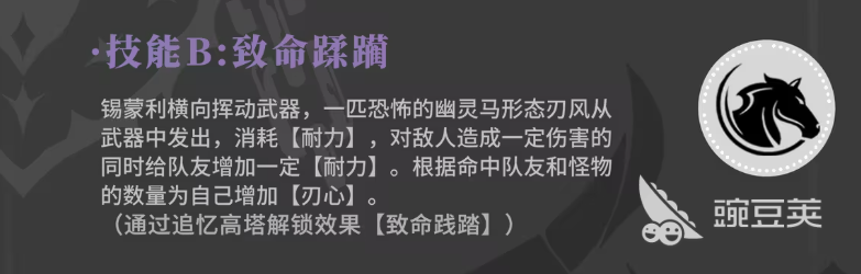 那么技能二的话叫做致命蹂躏,使用这个技能的时候,锡蒙利也会带着武器来带来一个横向的挥动效果,此时除了基础的攻击动作之外,还有一个召唤的效果,但是她召唤出来的都是灵体类的召唤物,这个技能里面的召唤物是幽灵马驹,从刃锋里面出现,也就是从武器里面出现的这些幽灵马驹会消耗一定的耐力,对敌人造成伤害,然后给队友增加一定的耐力,所以大家也看成是一个伤害的同时给全队带来增益的技能,这样的技能在命中敌人之后,还可以根据队友的效果来给自己增加一定的韧性,所以在很多群怪的关卡里面,这个技能是比较好用的。