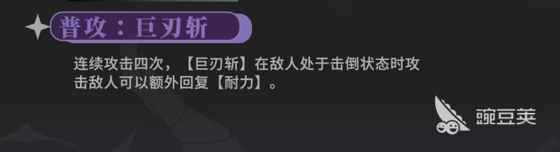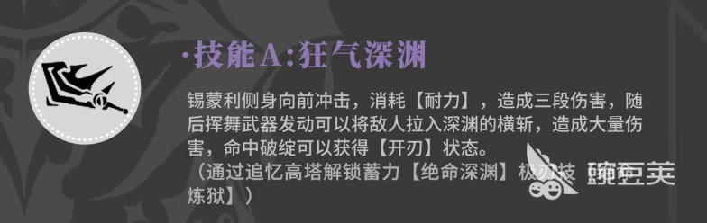 锡蒙利这个角色她本身是SR品质的品质,因为是刀剑类角色,所以在效果上面都是需要利用武器进行输出的,她在普攻上面连续带来的输出次数是4次,这里的话,锡蒙利主要使用的是巨人斩的效果叫做巨人斩,这是基础的攻击招式,带来的也是比较普通的数值,但是如果是在敌人击倒状态下进行攻击的话,带来的输出会更强大一些,有耐力加成的话输出还会更上一层楼,而魂技叫做无情斩。