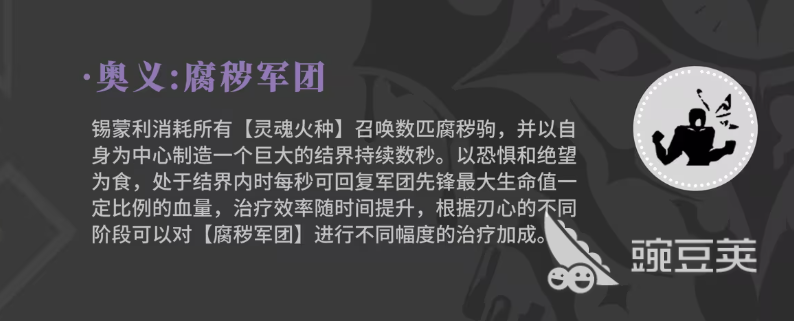 在锡蒙利大招上面,是需要消耗所有灵魂火种的,甚至会召唤出来很多的腐秽军团当中的灵体进行输出,并且这些军团里的成员,会在战斗的中心处制造一个巨大的结界,此时这个结界持续的时间比较长,在结界持续的时间之内,敌人都会受到一定的负面影响,而且如果是在这个结界范围之内还有其他队友的话,那么队友还会获得一定的增益,当然首要是给军团先锋带来一定的生命值提升,此时带来的恢复血量数值也会得到提升,在治疗效率提升的同时,还可以根据韧性的不同阶段对锡蒙利召唤来的军团成员,进行不同幅度的治疗加成。