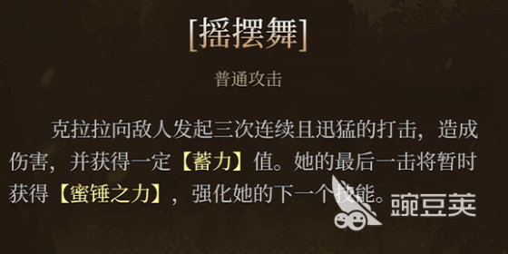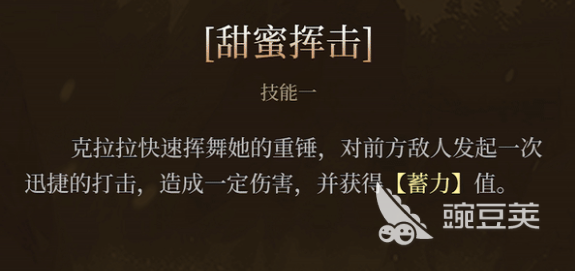克拉拉的技能一叫做甜蜜回击,使用这个技能的时候,同样会利用到她手中的锤子,对敌人发起一次速度很快的输出,造成伤害之后一样会有蓄力值提升的效果,当然相比技能一的话,她的技能二效果更丰富一些,使用技能二,克拉拉会一边移动一边使用手中的大锤,然后旋转向前进行移动,这个移动可以看成是一个位移的效果,此时只要是周围的敌人,在她位移前进的路径里面,周围的敌人都会受到一定的伤害,且根据伤害数值会恢复一定的蓄力值,如果这个技能命中的话,那么技能还可以带来一次派生的效果,后期派生会变成蜜蜡锤、野蜂轮舞的效果。