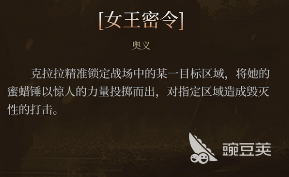 之后还有一定的削刃可以附加,当克拉拉使用蓄力释放这个技能的时候,还会获得一定的蜜锤之力,强化她下面一个技能,在大招上面她还有一个女王命令的技能,这个大招为克拉拉带来的是一个范围输出,只要使用这个大招,她会锁定战场里面的一个区域作为自己的输出目标,此时利用她手中的蜜蜡锤进行投掷输出,所以算作是一个远程输出效果,对敌方指定的区域带来大范围的输出打击,那么在她有足够的蓄力值的时候,大家还可以让她的派生与状态联动起来,技能二其实只要命中之后还可以强化后期的连招,配合她积累的蜜锤之力,还可以形成一定的爆发输出。