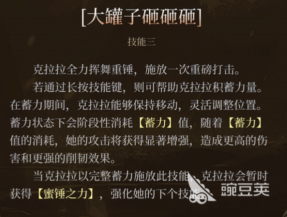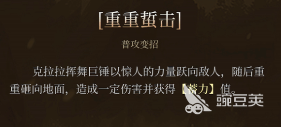 这里的蓄力值就是她后期能够消耗的能量,想用大招的话,一般前期蓄力值就要积累足够的数值,而她的最后一击在普攻上,也就是连续几次输出的最后一击一定会获得额外状态,叫做秘锤之力,也是一个专属于她的能力,这个秘锤之力会强化她的下面一个技能,后期使用她的普攻变招的话,就需要这个状态,那么她的普攻变招就是强化以后会变成重重蛰击,这个技能使用的时候会挥舞她手中的巨锤,此时她还有一个移动的作用会直接靠近选中的目标,然后将这个锤子砸向地面,造成一定的伤害,同时也可以带来一定的蓄力值,积累在主动技能上面。