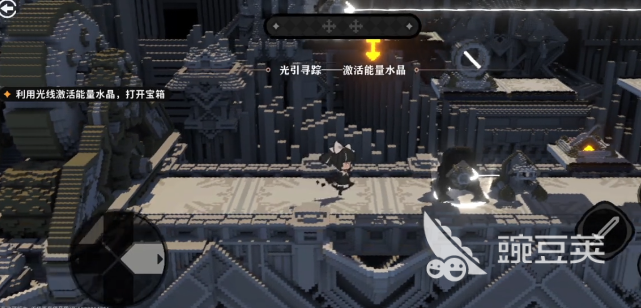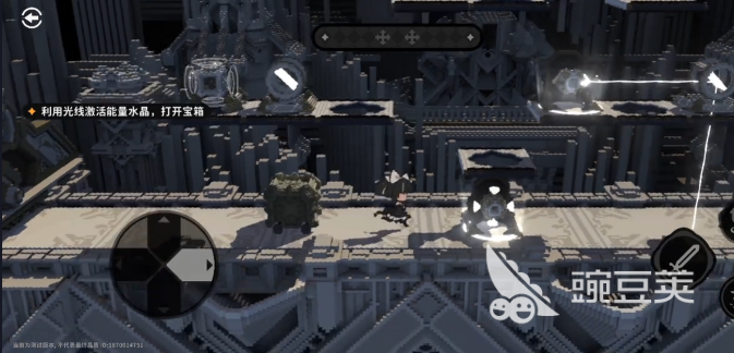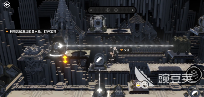 在进入到第1个关卡时,难度真的很简单。玩家可以开启寻宝人的挑战,先直接跳到第1个交互点,接着又跳到第2个交互点完成光线的调整之后就可以拿到奖励。那第2个关卡就是直接跳到平台上,接着跳到第2个平台,只需要点一下交互,就可以让镜面翻上去。这个时候的平台就可以慢慢的降到底,等到落地之后往左边跳,可以精准的落到中央交互点的位置。