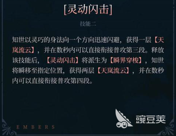 如果是命中的敌人身上带有封印效果的话,此时将击碎他身上的封印,获得一层封印值,如果是释放月灵散射的话,那么这个技能还会加上封印解放的效果,这个效果就是解放之后带来额外5次灵箭输出,在技能2上面,她有一个灵动闪击的能力,就是使用这个技化的时候,会迅速的闪避一下,然后获得一层天岚流云的增益,并且在后期的几秒之内直接衔接下一段普攻,释放了技能之后,灵动闪击将会变成派生的效果,带来瞬间穿梭的效果,然后知世就会得到一个指定位置的瞬移,再额外获取两层的天岚流云增益,在后面几秒之内可以衔接普攻第4段进行输出。