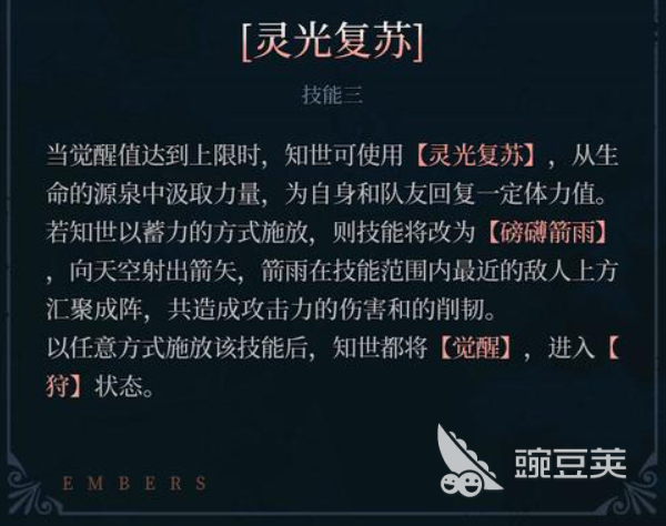 她的技能3叫做灵光复苏,也就是在觉醒值达到一定上限之后,就可以使用这样的灵光复苏带来一定的恢复效果,这里恢复的体力数值是给自身以及队友同时进行恢复的,如果前期有蓄力的话,那么这个技能就会变成磅礴剑雨的效果,剑雨技能范围之内生效的话,对敌人都会造成一定的阵法输出,同时造成攻击力伤害和削刃的效果,这个技能在释放之后只是将进入一个觉醒的状态,也可以触发她的被动效果。