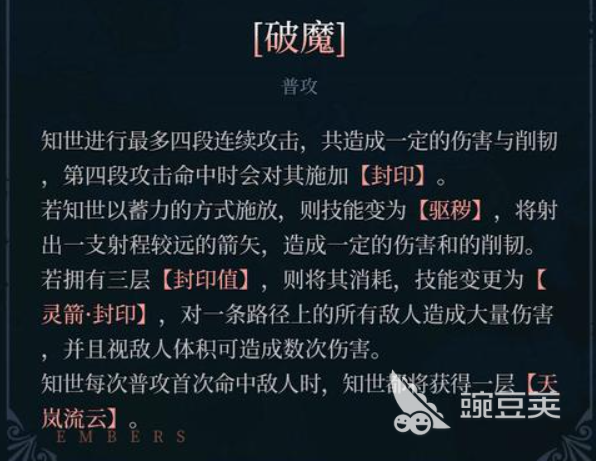 在技能上面,知世使用的武器叫做天岚流云箭,这是一把玉虚院家族里面的人才能使用的武器,在输出的时候一般都会带上庇佑的效果,在一下中使用技能的时候,知世可以带来一个叫做破魔的普攻,在进行普攻攻击的时候最多是可以带来4段连续攻击的,而且可以造成一定伤害之后还可以给敌人带来削刃的效果,在第4段攻击里面,她还可以给敌人施加一个封印的能力,如果此时以蓄力的方式进行技能使用,这个技能还会变成驱秽的效果,射出一支射程相比普攻来说更远一些的箭矢造成伤害。