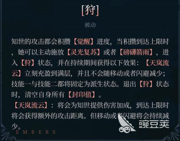 知世的被动叫做狩,就是在攻击的时候只要达到了一定的觉醒进度,那么此时积攒达到上限数量的时候,她就可以主动释放灵光复苏的技能,或者是使用磅礴剑雨这个技能,此时的话就会进入这个被动的状态,也就是狩状态里面,只要是在这个被动状态里面,知世就可以获取天岚流云的效果,这个状态会立刻冲到满层的效果,并且不会随着角色移动或者是闪避来减少数值,技能1以及技能2的话,此时都会变成派生状态。