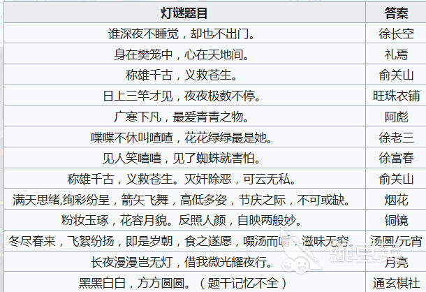 这些灯谜到底是什么样的答案呢?可以看一下过往的灯谜照着背,那肯定是没有错的。人物题那边直接认准俞关山。那边的题目大部分都是围绕npc,例如称雄千古,勇救苍生,说的就是他自己本人。这一道题目还有过加长版本,例如加了灭奸除恶,答案不变还是他。身在樊笼中答案就是礼焉,而如果是深夜不睡觉却不出门,答案就是徐长空。喋喋不休叫喳喳的答案是许老三,总之记住这一些人物的特征,那么100%就可以答对。