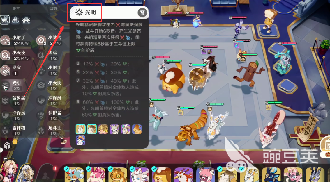 光明属性精灵的上阵数量,会直接提升基础攻击倍率和基础法术伤害,在光明属性叠加到九层以上时,开场时会释放一次光明普照效果,对敌方全体的单位,造成一次基于自身60%护盾数值的真实属性伤害,该伤害效果甚至能够媲美金色装备。