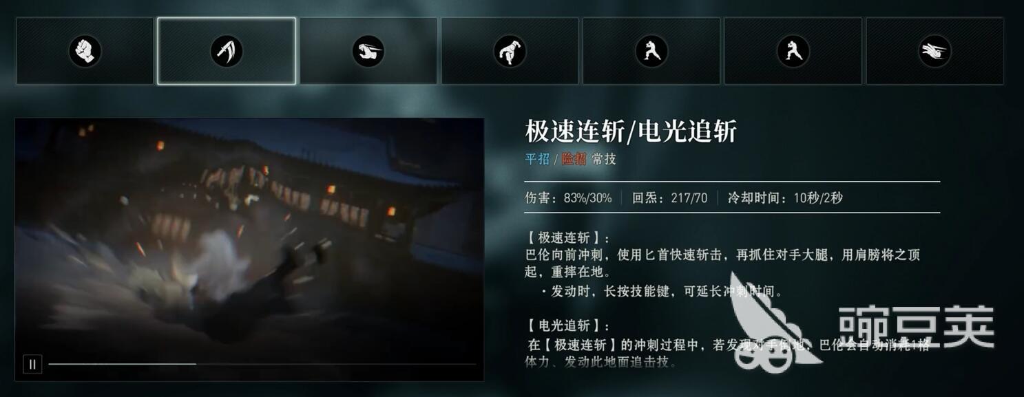 核心输出技能极速连斩是真的猛,按技能键向前冲刺匕首斩击,抓住敌人腿后顶摔在地,长按能延长冲刺距离,追远程敌人时很好用。而且最关键是冲刺中如果说敌人已倒地,会自动转电光追斩,贴地滑行斩击还减冷却,不过要注意电光追斩要消耗1格体力,这个机制让巴伦能对倒地目标持续输出,冷却短到几乎能连放两次。