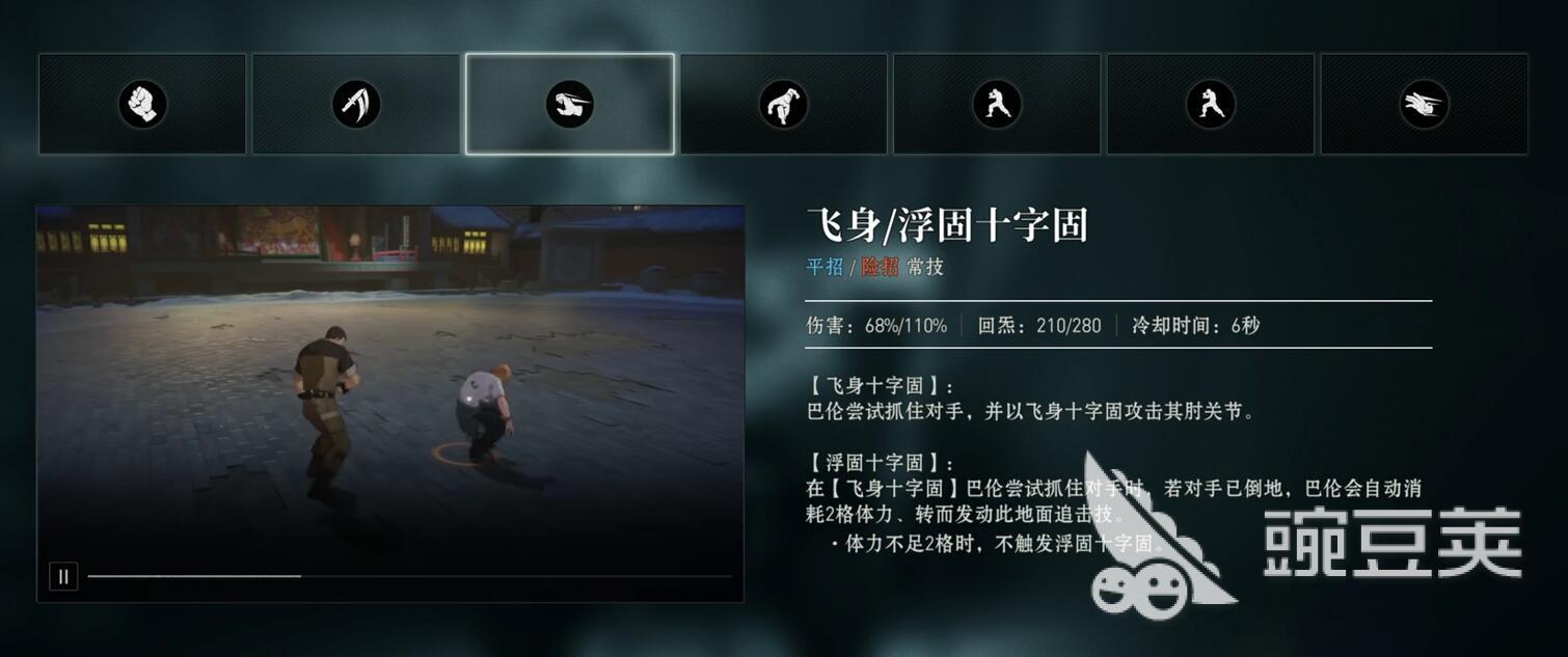 飞身十字固是近身抓取技,抓取成功就空中十字固锁关节,敌人倒地时变浮固十字固,趴在地上追加锁技的伤害比站立时高不少。这个技能回怒快,210/280的回怒值能快速攒大,就是前摇有点明显,对面一直跳的话很难中。所以合一先用破势突击击倒,倒地瞬间接这个技能成功率最高。