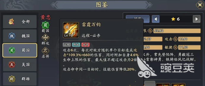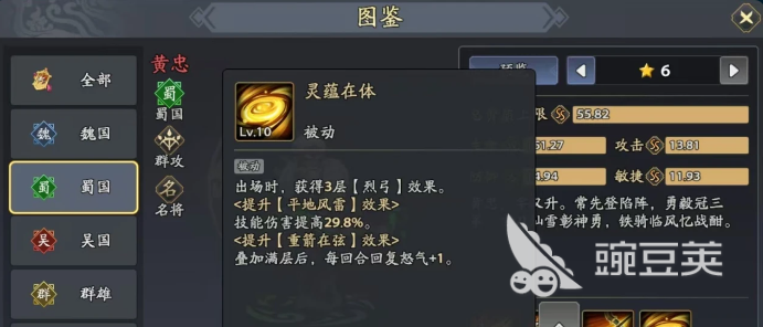 黄忠是一个纯远程的输出型武将比较擅长的就是群体攻击。这一点在推图时是比较实用的,毕竟群体攻击就可以迅速的清理对面的小兵,不需要和那些杂兵去磨叽。推图的效率还是比较高的,如果想要迅速的过剧情拿到关卡的奖励,那这一点很重要。接着还需要看一下核心优势,会有两个被动技能,第1个被动技能在出场之后就会有三层烈弓效果。而且还可以强化两个主动技能,例如平地风雷的伤害就会变高。重箭在弦在叠满层数之后,每一个回合还可以额外的增加一点怒气。怒气值在足够之后就可以放必杀,输出的节奏也可以加快。