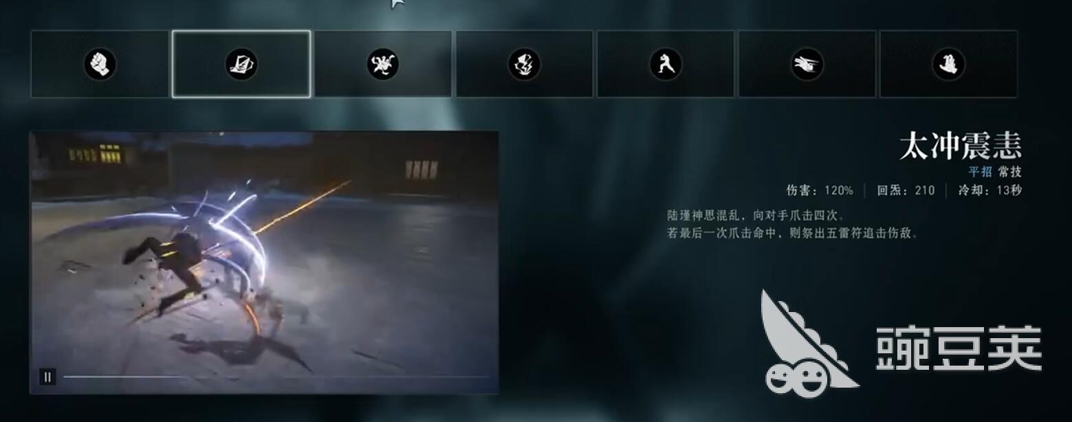 陆瑾的普攻大敦生憎是一个五段的普通玩法,每次伤害50%,回炁56点,是攒炁的重要方法,而且前三次普攻为直线爪击,后两次附带范围伤害,第五击命中后会触发短暂硬直,可衔接平招常技。平招中太冲震恚、曲泉交忿都是很强势的输出技能,前者四连击后接五雷符追击,曲泉交忿主打的是突进踢击接神霄雷符,但是太冲震恚的最后一击有0.5秒延迟,需提前预判距离,避免空招出真空期,很容易被抓住把柄。