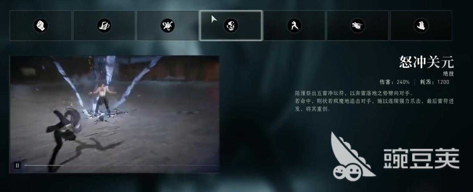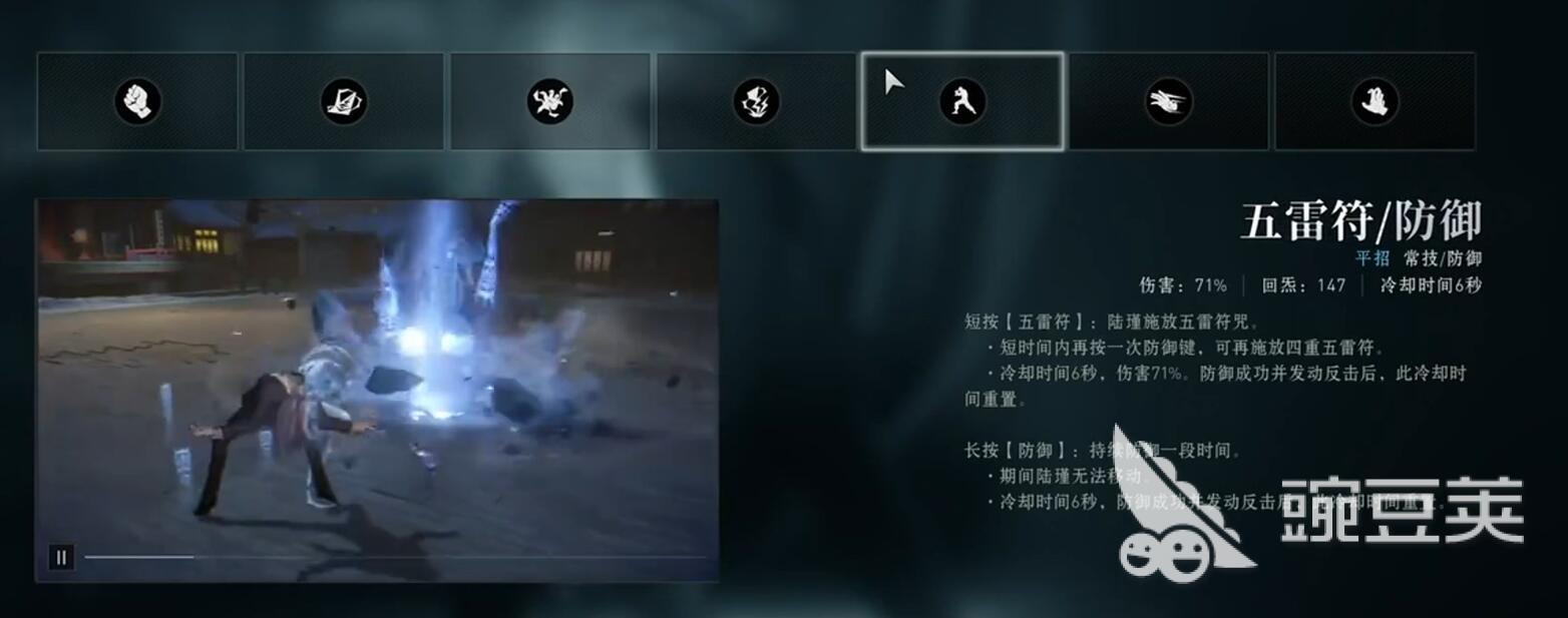 三技能双龙探爪是投技,100%伤害,必须在敌人近身时使用,抓取成功后能破防并造成僵直,被敌人防御时用这个技能特别管用,但前摇有点长,得预判对手走位,不然容易空抓。而绝技擎天提地伤害最高范围也大,释放时全程霸体,不过前摇明显,单独放容易被闪避,也是要穿插使用的。五雷符防御技能短按释放五雷符咒,长按则是进入防御状态,成功防御普攻后,进度条提示时机内点击普攻键触发反击,且反击成功会重置五雷符冷却。