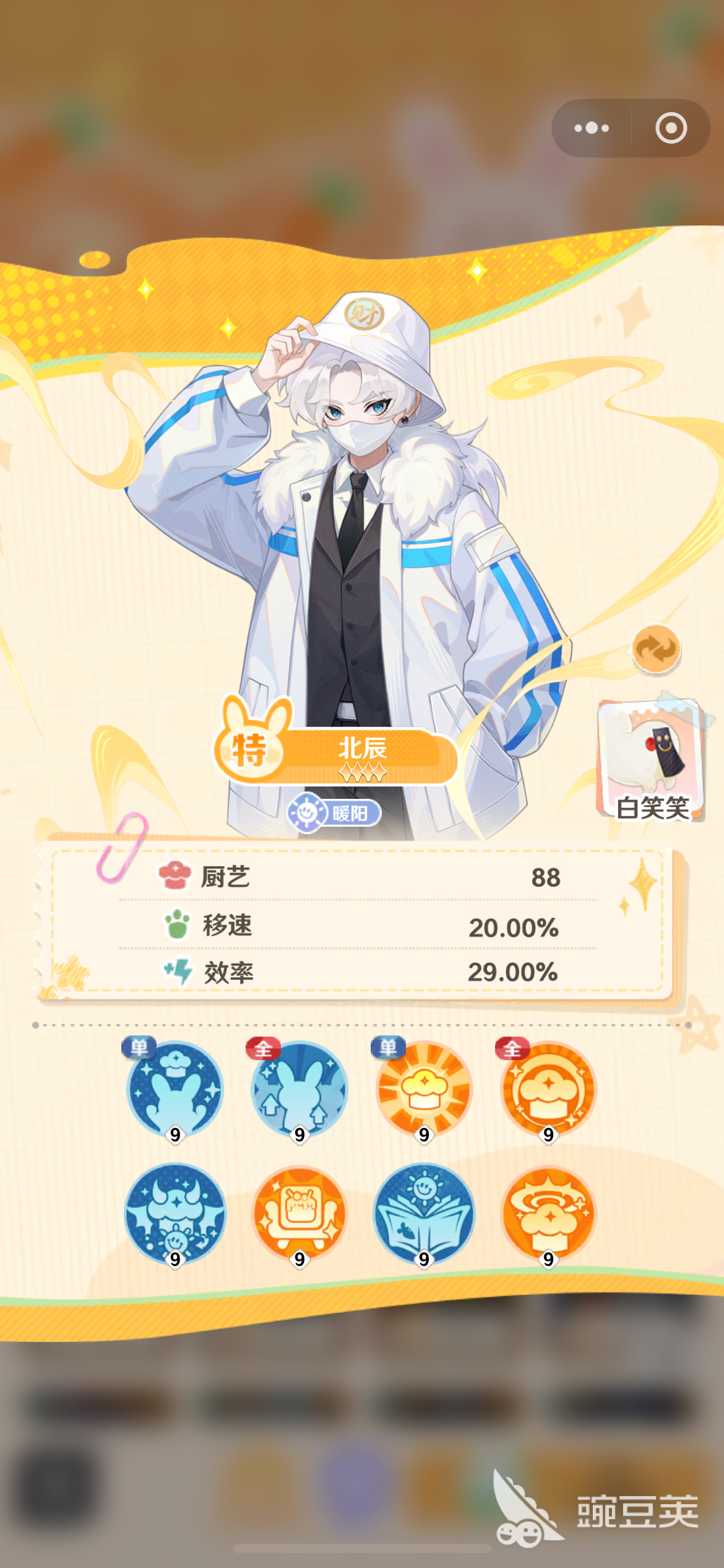 白笑笑是北辰的伴生灵,解锁北辰作为店员之后,白笑笑也会和他一同出现在屏幕中,管理店铺时会给店员带来巨大的帮助,无论北辰走在哪里,他都会处于一个待机状态。北辰看上去是一个冷面男,其实他的能力是非常高的,在移速方面就能够达到20%,管理店铺或者是烹饪美食时的工作效率就能够达到29%,聘任他作为店员对店铺的一系列的设施和经营进行管理完全可以放心了。