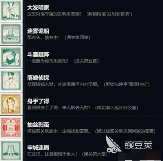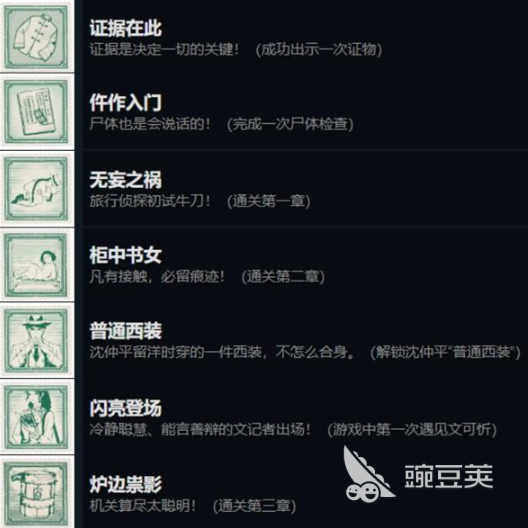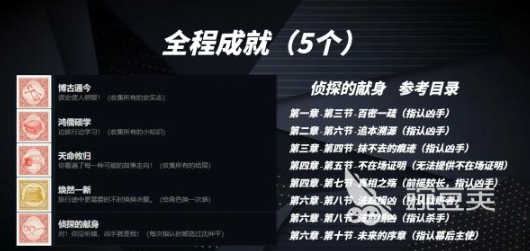 现在总共会有6个章节,每一个章节里都可以通过完成特定的事件达成成就,另外在整个流程中也会有很多不同的成就设定,如果玩家在挑战过程中可以一次性的出示关键性的证物,就可以解锁证据在此,挑战过程中,完成尸体检查之后能解锁仵作入门,完成第一个章节之后,还能解锁无妄之祸成就,接着在第二个章节中,角色换上西装,就可以解锁普通西装,在完成第二个章节挑战的过程中,可以用碳条把所有的信件涂抹,这样就会解锁一丝不苟的成就。