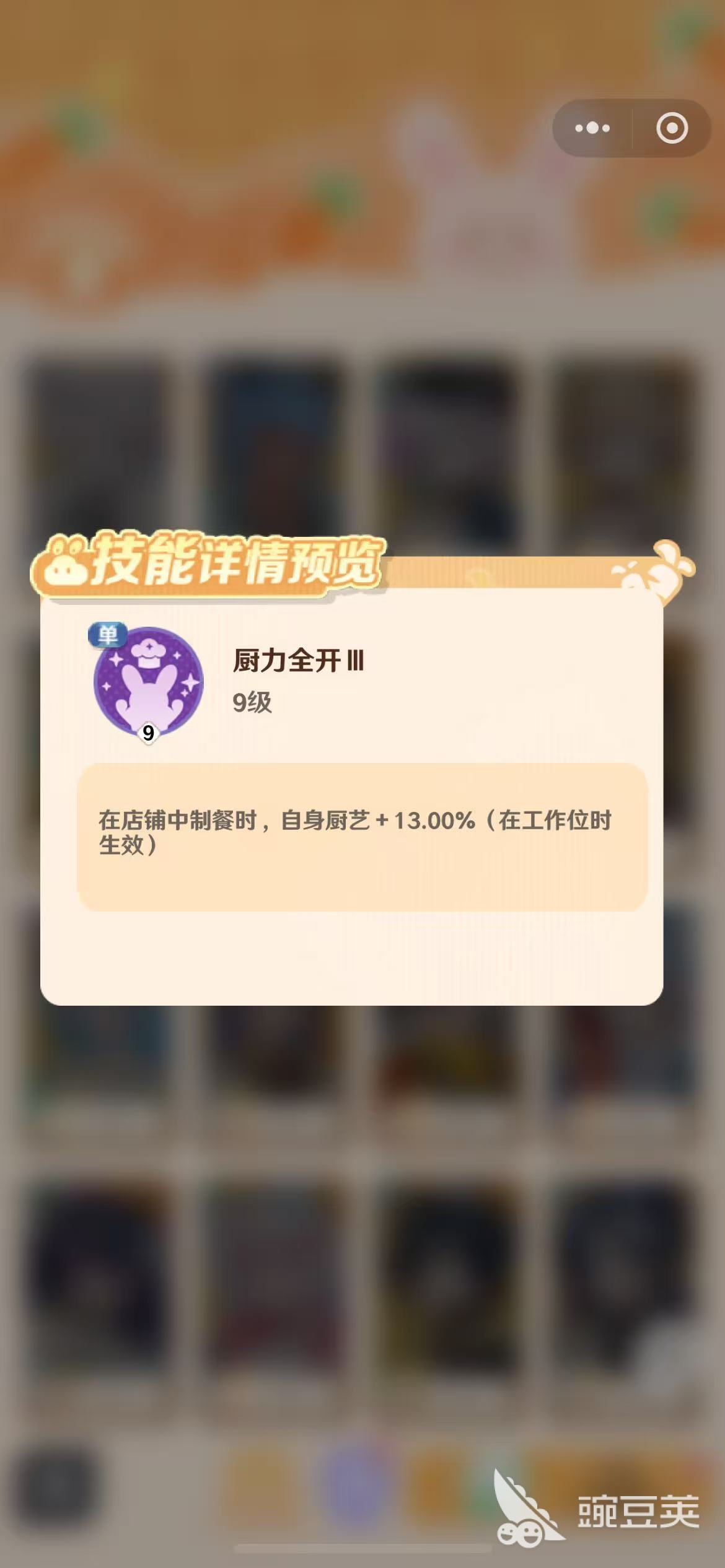 只要在店铺中制作美食,他自身的厨艺每次都会增加13%,厨艺水平在不断的进步。全体性的技能就是厨艺共鸣,经营店铺时,所有店铺成员的厨艺都会增加3%,即使小店客人入座率高达80%的时候,他也能够以自身移速400%去积极的投入到订单的完成和制作中,是一个集体认真的员工,凭借着自己一般的能力,为小店创造出更加辉煌的业绩。另一个全体性的技能是厨艺交响,只要在进行店铺时,所有店员的厨艺都会加150,将这两个全体性的技能有效利用起来,小店要规模扩大指日可待。他也会经常的投入到美食仙人的学习中,获得6.5%的食谱秘料,研制出全新的菜品,给那些顾客们拥有更多选择的机会,让美食传遍大江南北。