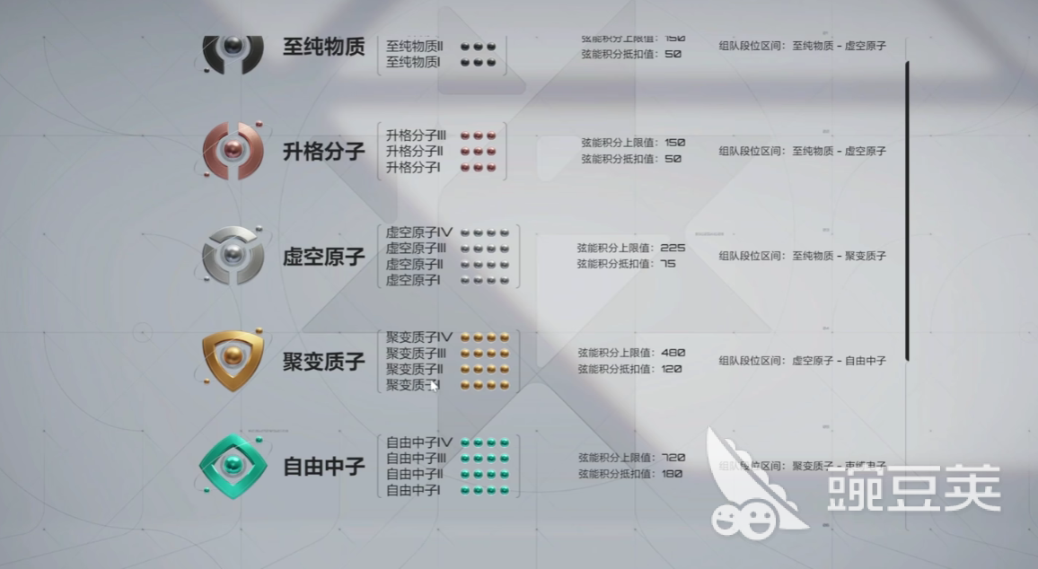 游戏内的段位划分的具体为:至纯物质、升格分子、虚空原子、聚变质子、自由中子、束缚电子、禁闭夸克、无限超弦、奇点。